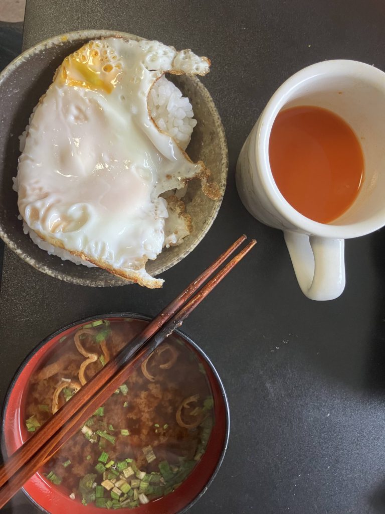 朝食はたいていご飯と即席味噌汁と目玉焼き、野菜ジュースで固定しています。