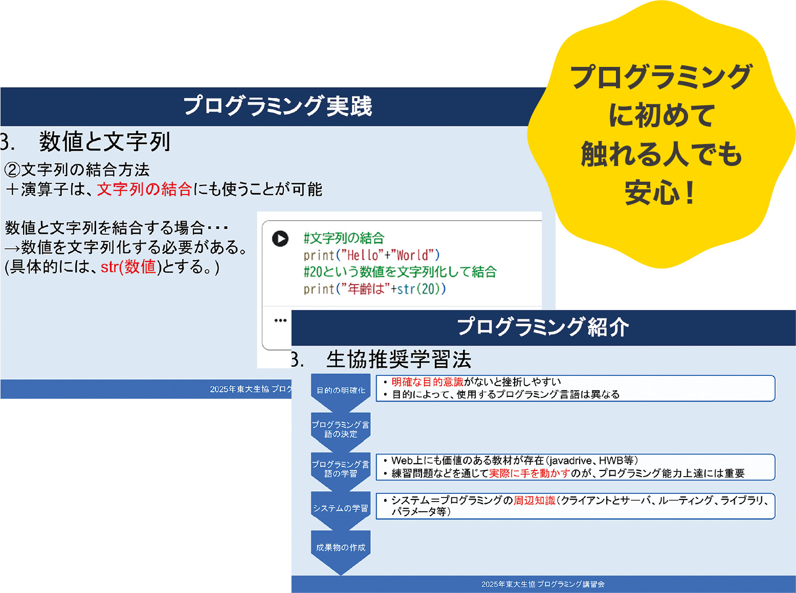 私の周りにも多いです。新入生の皆さんには、この講習会を通じて、「プログラミング学習を自分自身の力で